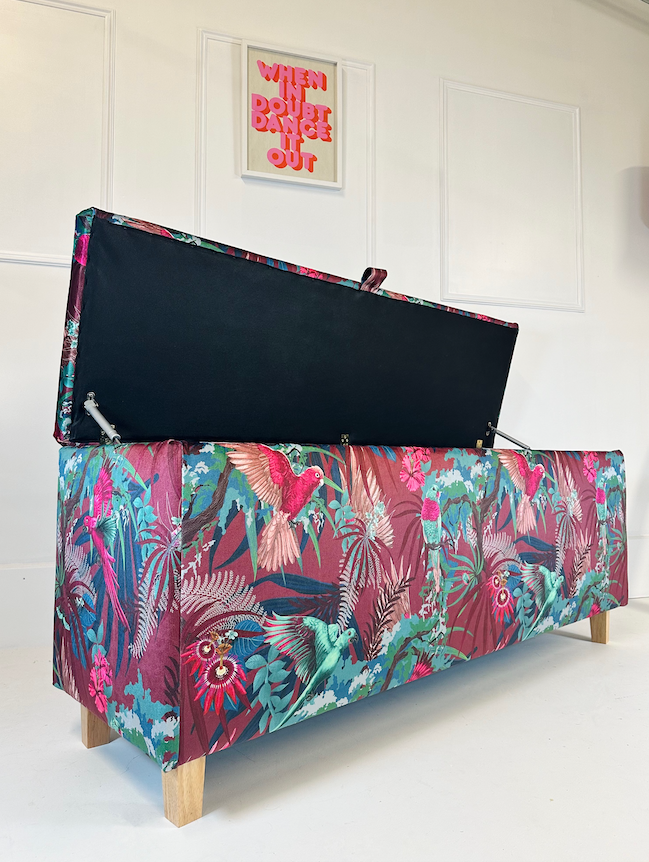 A truly stunning Ottoman in Balloon Safari Velvet by Becca Who. An opulent homage to the Rainforests and its Birds, this designer fabric is rich with intertwined wings and decorative foliage. Painterly artwork fills the fabric with details of exotic bugs and flowers waiting to be discovered.